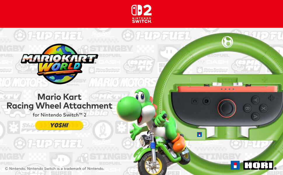 Start your engines and get ready to zip through the Mario Kart World courses with the HORI Mario Kart Racing Wheel Attachment (Yoshi). Simply pop your Nintendo Switch™ 2 Joy-Con™ 2 or Nintendo Switch™ Joy-Con™ controller (each sold separately) into the racing wheel attachment and enjoy the lightweight feel and textured grips. Featuring responsive shoulder buttons for easy controls and game immersion. Officially Licensed by Nintendo®.