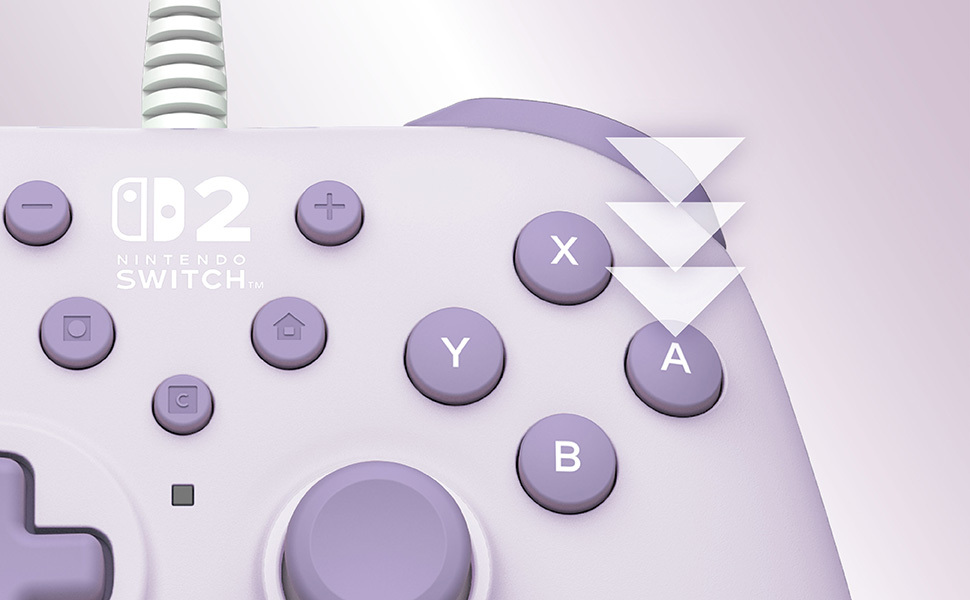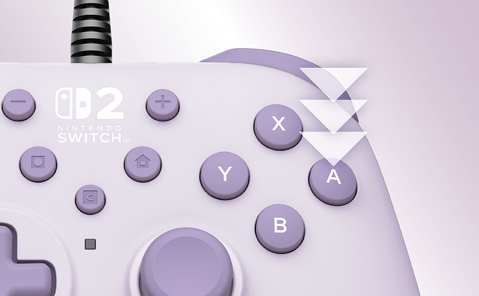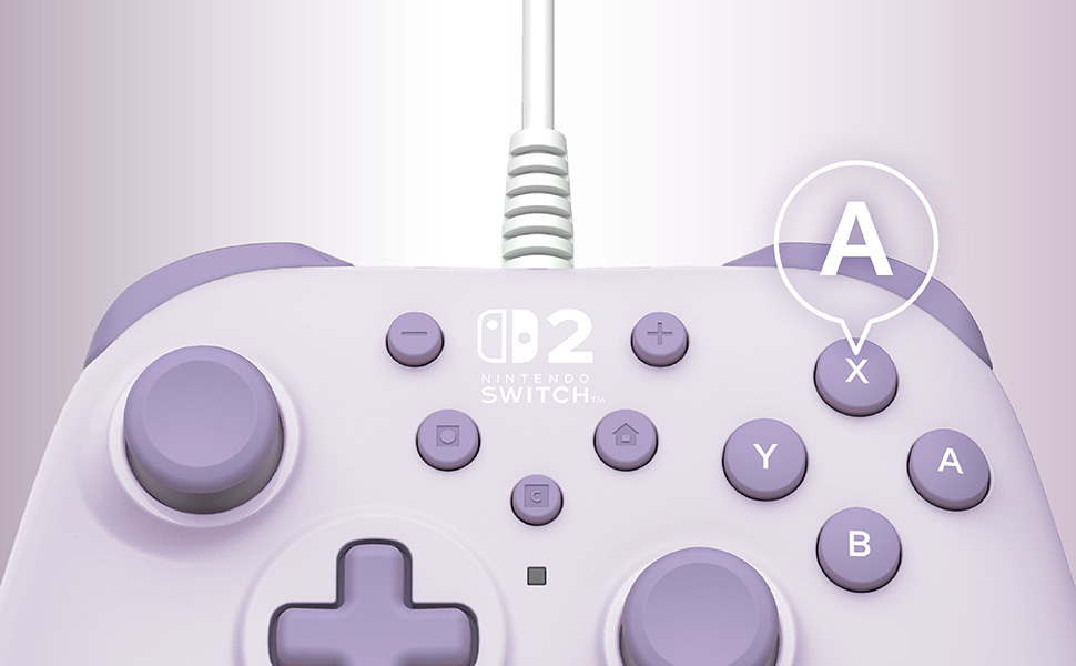 Explore new Nintendo game worlds and levels with the HORIPAD Turbo for Nintendo Switch™ 2 in Cozy Lavender. This sturdy, ergonomic controller boasts an array of features including programmable rear buttons, precision analog sticks, Turbo settings and more. Assign functional to change button functions freely to customize your play experience! Wired functionality provides lightning-fast responses and tournament-ready performance, while an ergonomic grip and a lightweight profile ensure continued comfort. Connect to your system through the USB-A 9.8 ft cable. Compatible with Nintendo Switch™ 2, Nintendo Switch™ and Nintendo Switch™ – OLED Model. Officially licensed by Nintendo®.